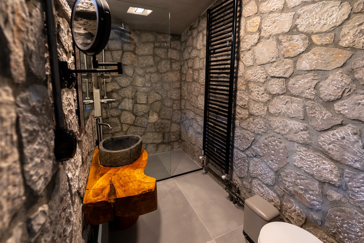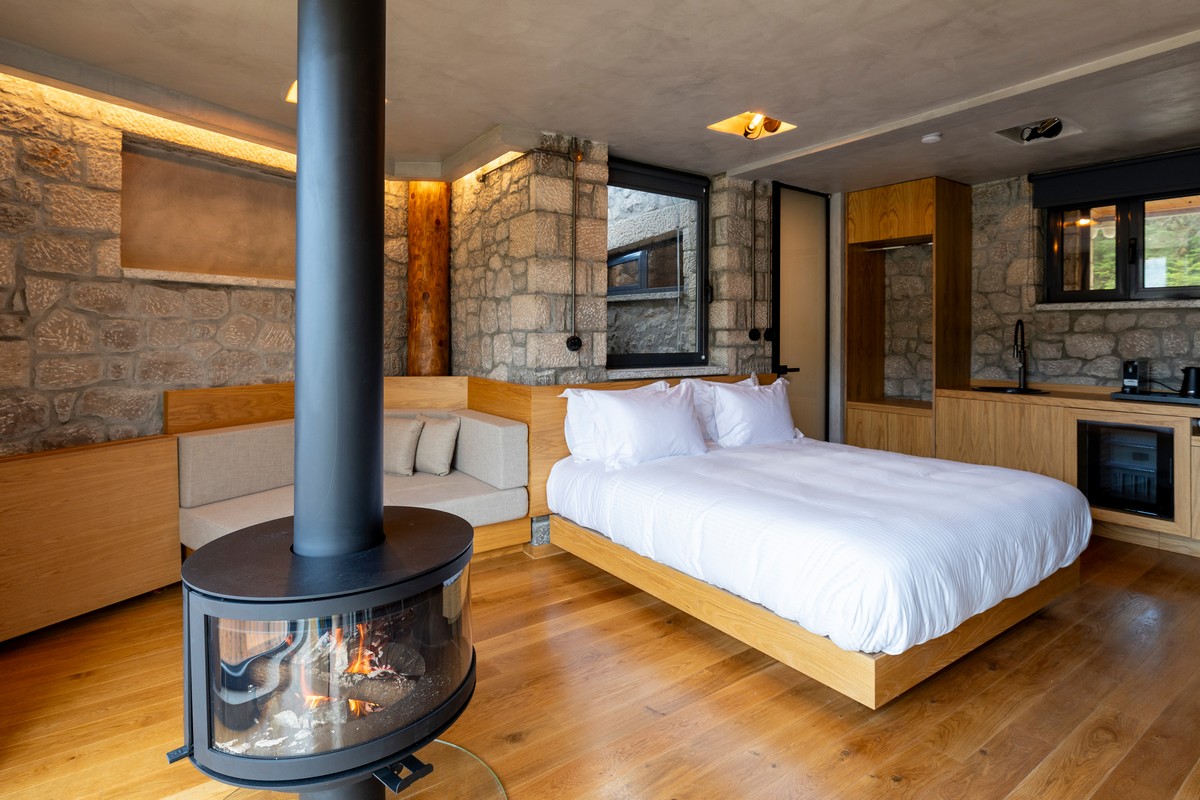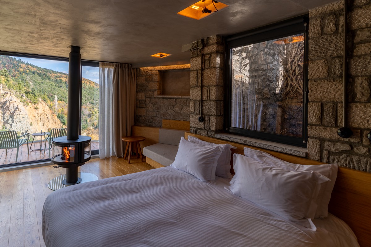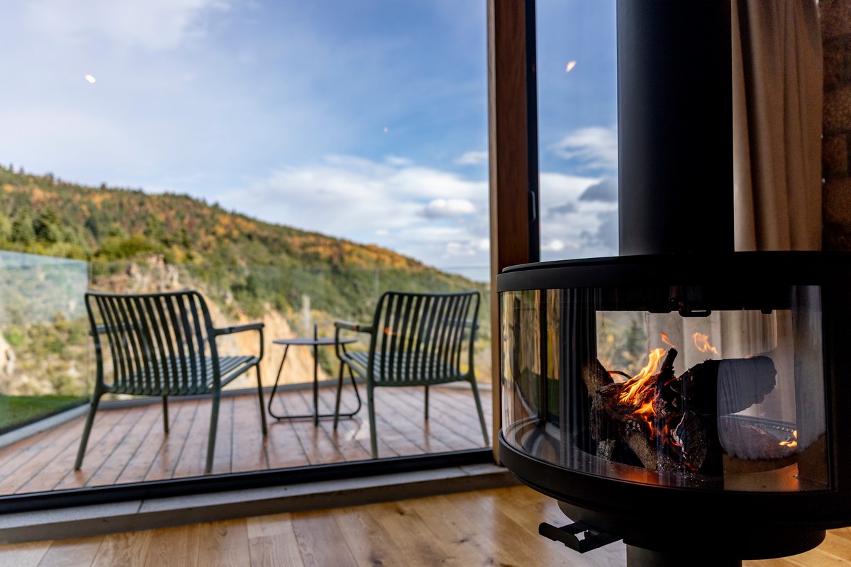 The Ember Room, located on the upper floor, offers 37 square meters of cozy and relaxing moments with breathtaking landscape views. Designed for two, this intimate retreat features a striking suspended fireplace, that brings warmth and atmosphere to every evening. A private balcony invites you to bask in the serenity of the forest and the sky, creating a space where comfort meets nature’s quiet embrace.